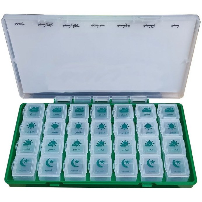 محفظههای 4 گانه: هر جعبه کوچک دارای چهار محفظه مجزا با برچسبهای “صبح”، “ظهر”، “عصر” و “شب” است.